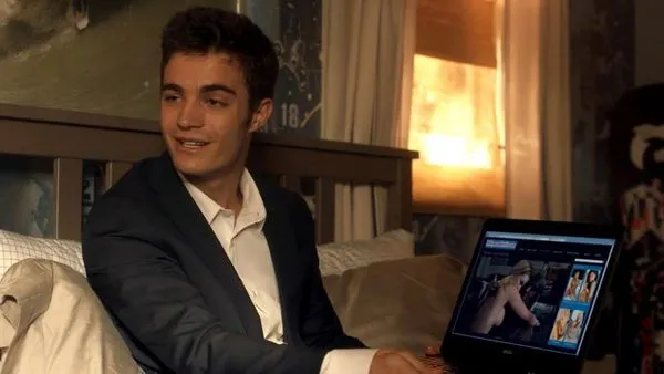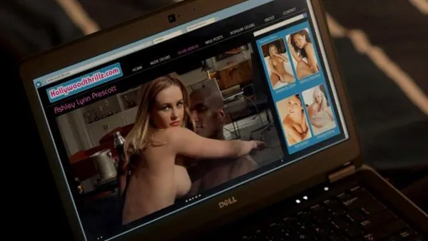 Ambyr Childers naakt laat haar volledige rechterborst zien. Ze zit bij een man op schoot met haar armen om hem heen in een sekstape. Het wordt bekeken op een laptopscherm.