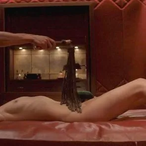 In deze scène uit ‘Fifty Shades of Grey’ kun je Dakota Johnson naakt zien terwijl ze over de massagetafel buigt. terwijl meneer Grey haar met een leren zwarte zweep slaat, begint Dakota te huilen en als ze opstaat, is er zicht op haar harige naakte poesje!