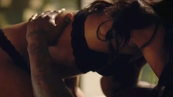 Dan hebben we Gabrielle Union naakt van bovenaf op haar rug gezien. Ze heeft seks met een man, terwijl haar benen om hem heen zijn gewikkeld.