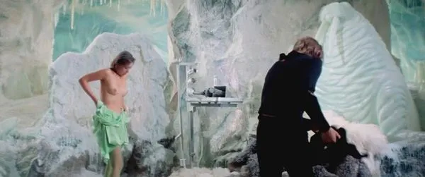 Bekijk de laatste, Jenny Agutter naaktscène uit ‘Logan’s Run’. Ze kleedt zich uit in een ijsgrot met een man. Jenny doet haar groene jurk uit om haar borsten en kont te laten zien voordat ze een vacht oppakt om zichzelf te bedekken.